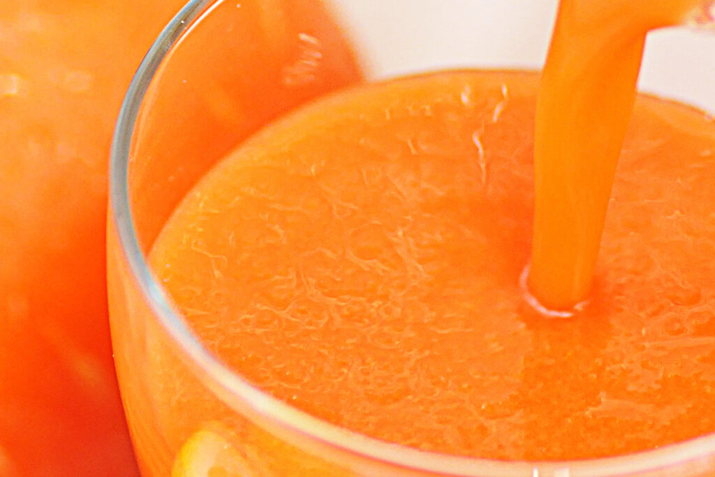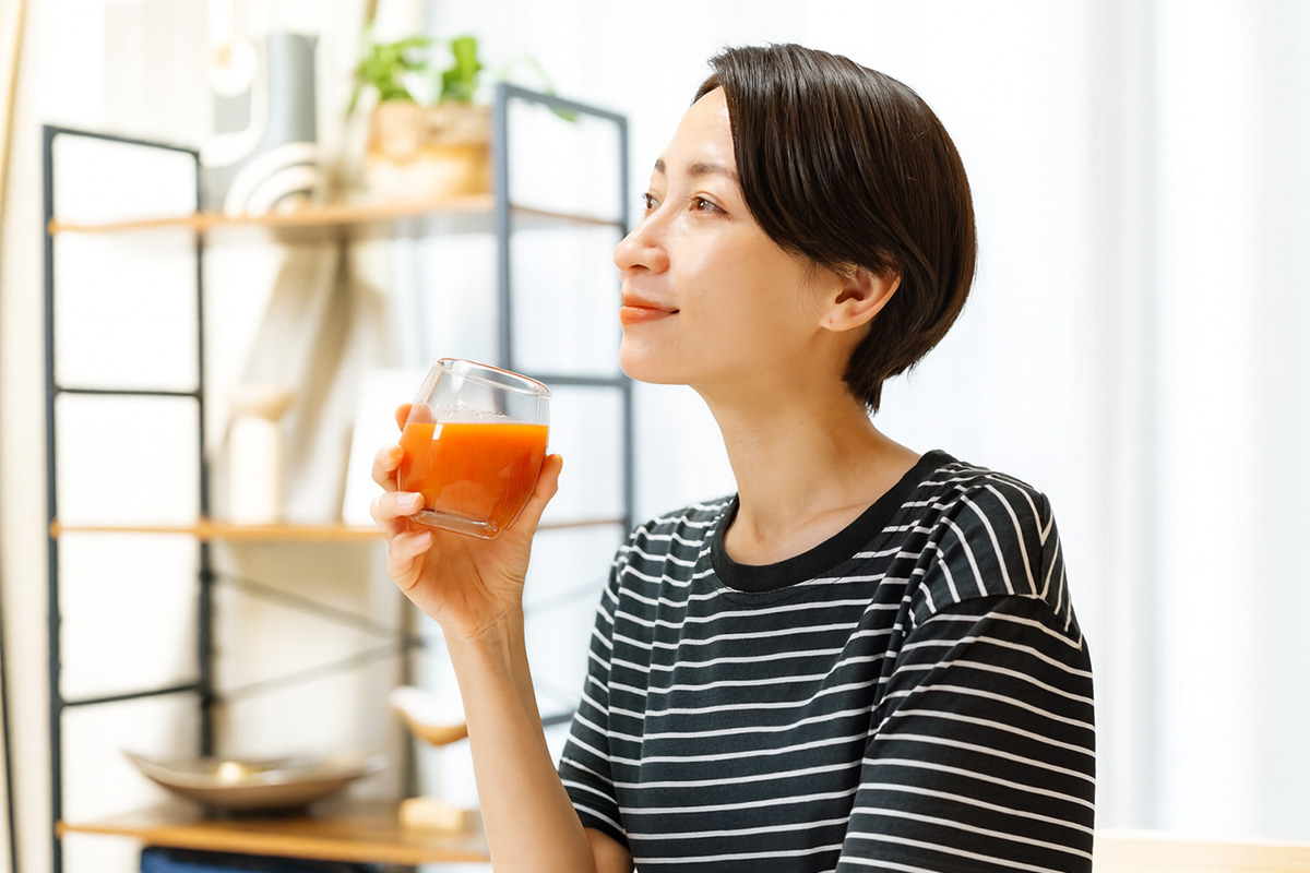 朝は胃腸の働きがゆるやかにスタートするタイミングです。野菜や果物をジュースとして摂ると、消化の負担が少なく、栄養素を自然に摂りやすいというメリットがあります。特ににんじんに多く含まれる βカロテン(プロビタミンA) は、脂溶性ビタミンで、油と一緒の方が吸収されやすいことが知られています。
